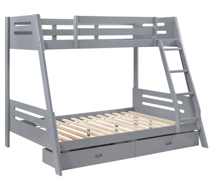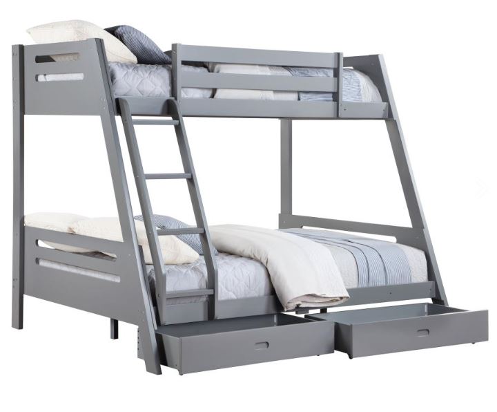 Reimagine a kid's bedroom with the versatility of a modern twin-over-full bunk bed with drawers underneath. Perfect for a range of spaces, it's a great choice for guest accommodations, siblings sharing a room, and sleepovers with friends. The bed boasts wooden construction with a soft grey finish that instills contemporary flair. The upper twin bed includes safety rails and a ladder that installs on either the left or right to best suit your space. Under the lower full bed, two drawers create added storage, perfect for linens, seasonal clothing and much more.
