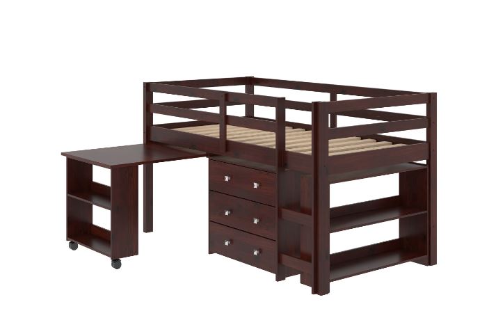 Student low study loft is a huge space saver for any small bedroom, this bed has everything a student would need; a writing desk, 3-drawer chest for all your clothes, and a small bookcase at the end of the bed for added storage.