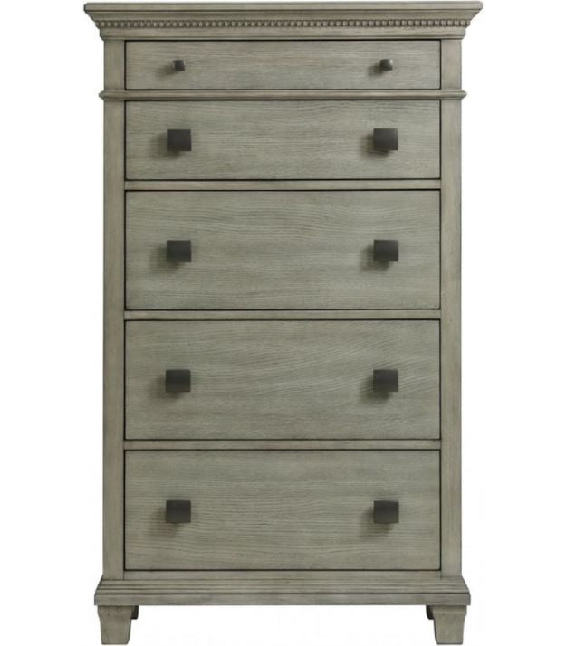 Intricate wood carvings, clean lines, and a modern grey finish come together to create this transitional drawer chest. With the perfect mix of traditional elements and modern finishes this piece will add a touch of style to any space.