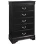 The Five Drawer Chest is an enchanting addition to your sleeping space. Made with select hardwoods and a black finish, this piece is warm and matches well with any décor. This piece has beautiful features such as simple molding at the top, metal bail handles and bracket feet. Use the five drawers to store clothing items or extra blankets. For style and storage, this chest is sure to please.