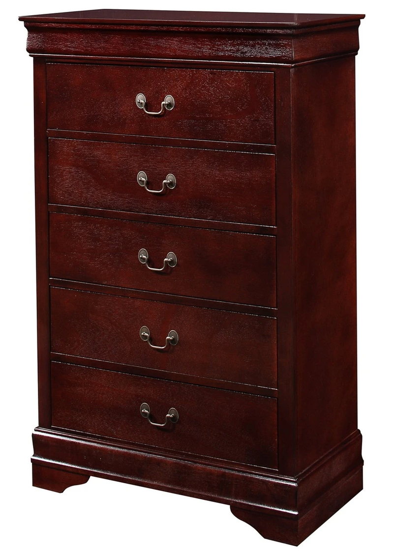 The Five Drawer Chest is an enchanting addition to your sleeping space. Made with select hardwoods, cherry veneers, and a cherry finish, this piece is warm and matches well with any décor. This piece has beautiful features such as simple molding at the top, metal bail handles and bracket feet. Use the five drawers to store clothing items or extra blankets. For style and storage, this chest is sure to please.