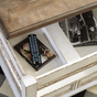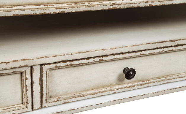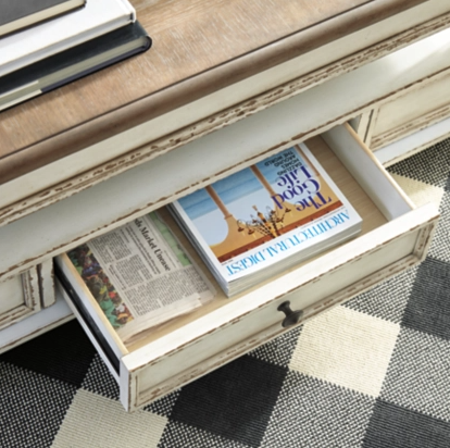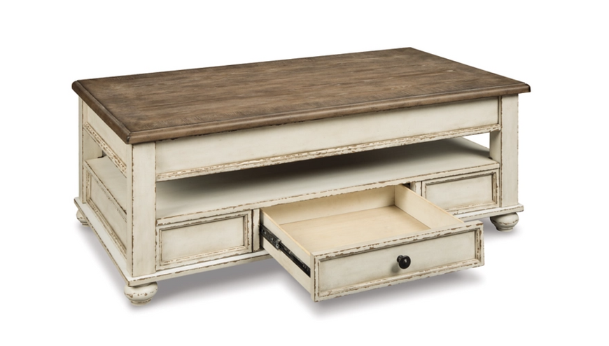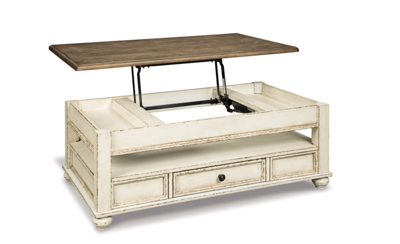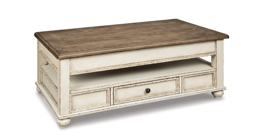 This lift top coffee table is traditional cottage styling taken to a new level. Antiqued two-tone finish blends a chipped white with a distressed wood finished top for a double serving of charm. Crafted with quality dovetail construction, this coffee table with drawer and open shelf space melds function with exceptional form.