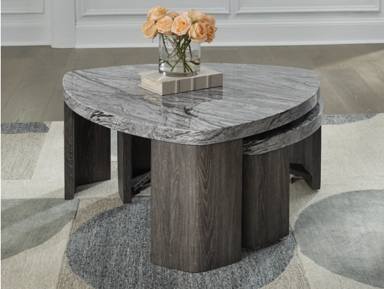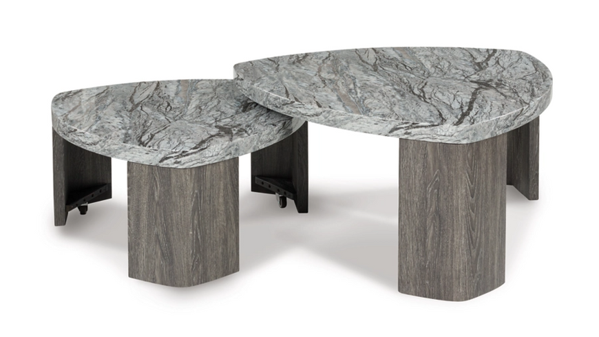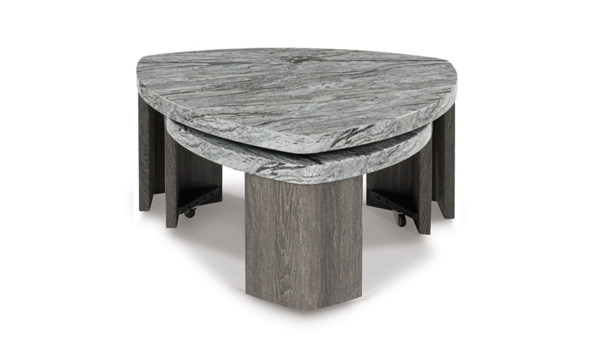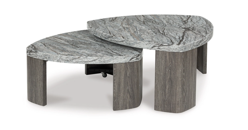 Striking contemporary form, meet can’t-miss function. This stacked coffee table pairs the look of faux gray marble with a weathered gray wood grain for a simply chic approach to monochromatic style. Make the most of your space with its cantilevered design—simply roll out the pivoting lower table when you need...