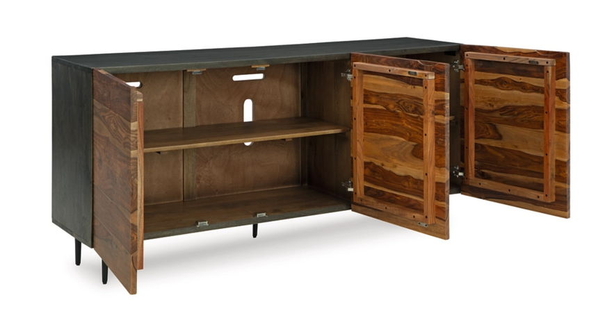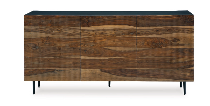 This mid-century modern inspired piece is skillfully crafted with durable solid mango and shesham wood. The natural and deep brown finish in addition to the fluted, grooved door fronts provide character anywhere it’s displayed. Pair it with sumptuous velvet upholstery and accents in a brushed brass-tone finish for an exquisite look.