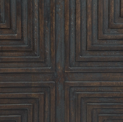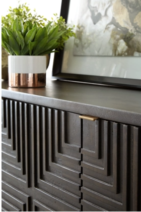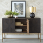 This accent cabinet is a versatile stunner with 3 geometric patterned door fronts in warm dark brown accented with goldtone finish metal hardware. Standing on a goldtone metal open frame base, the three-door console is aesthetically contemporary and sophisticated, ready to serve as buffet, console or media cabinet. Solid and...