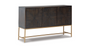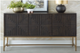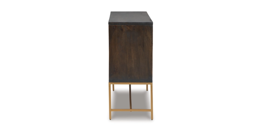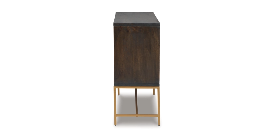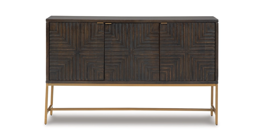 This accent cabinet is a versatile stunner with 3 geometric patterned door fronts in warm dark brown accented with goldtone finish metal hardware. Standing on a goldtone metal open frame base, the three-door console is aesthetically contemporary and sophisticated, ready to serve as buffet, console or media cabinet.
