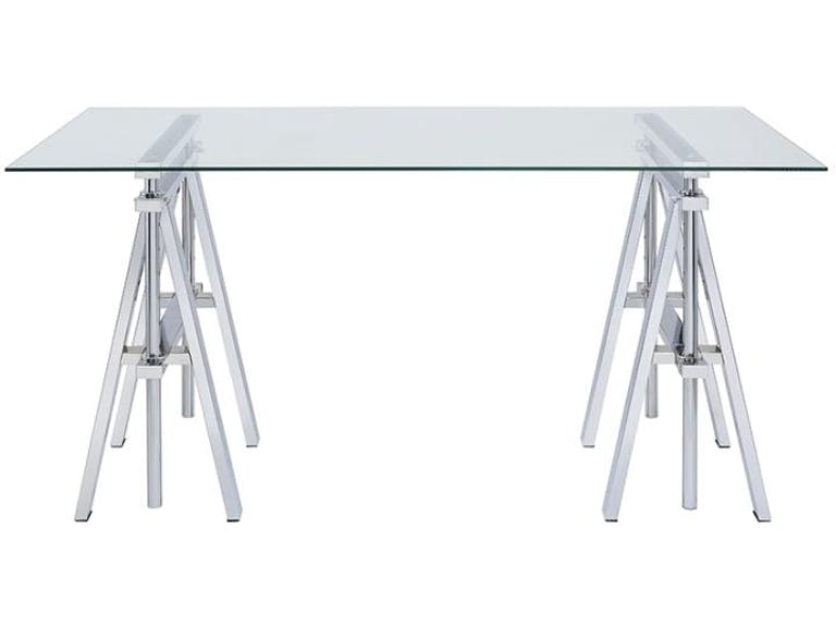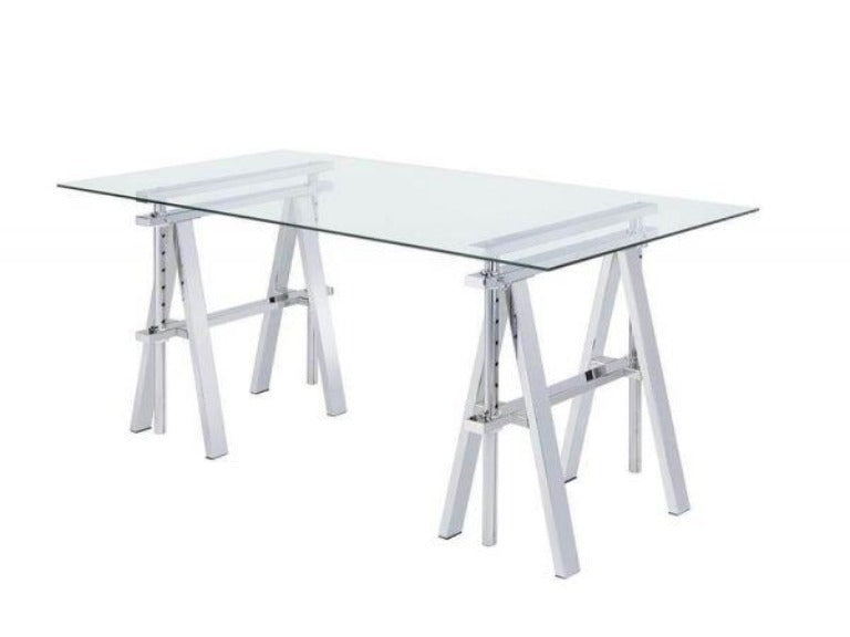 Work from a sitting or standing position with the Chrome/Clear Adjustable Writing Desk. This modern desk features an architectural design with a gleaming chrome finish covering the steel. The clear glass top provides a minimal look to the design. Clear tempered glass top, and elegant look that gives an enticing look to your home office.