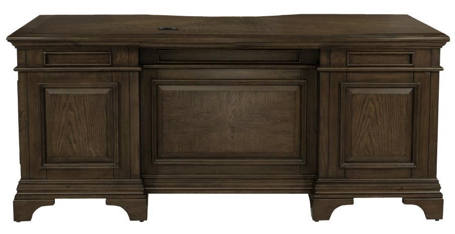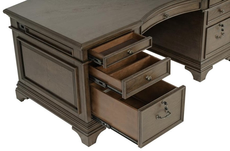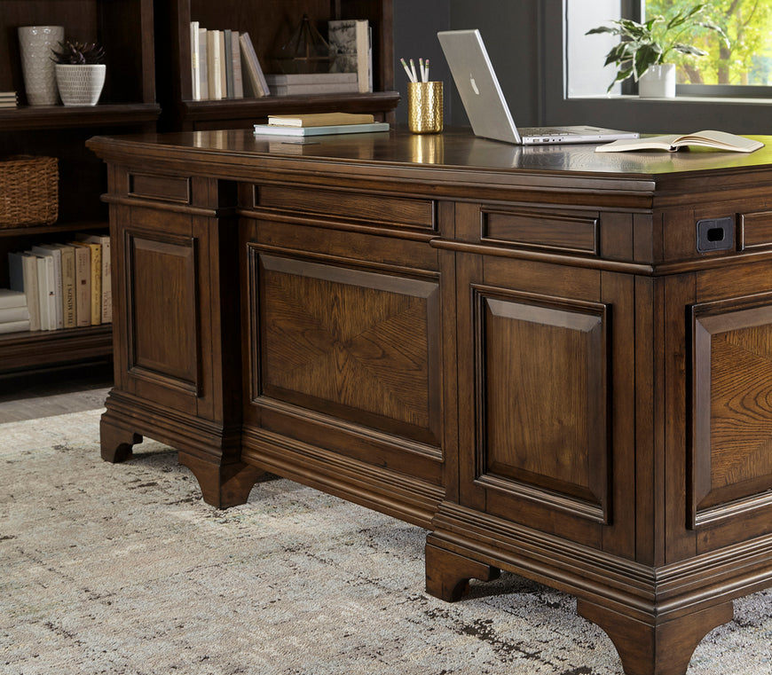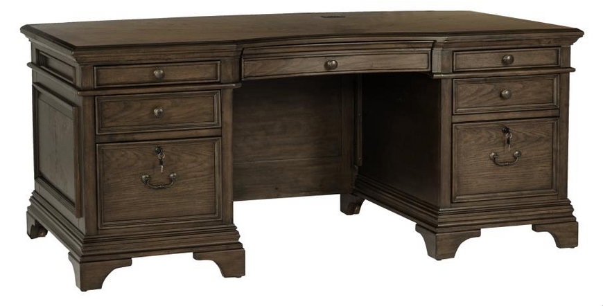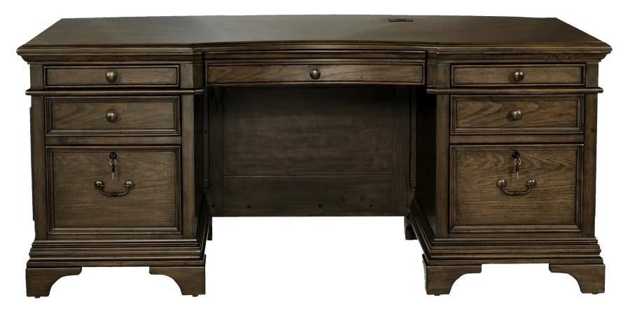The Hartshill Executive Desk brings a traditional elegance that comes in a beautiful burnished oak finish. It features ample storage with its seven drawers adorned with metal bails and knob hardware. It stands on bracket feet and is adorned with decorative moldings.