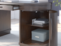 - Right-side cabinet includes cutouts for cord management and ventilation for use with a CPU