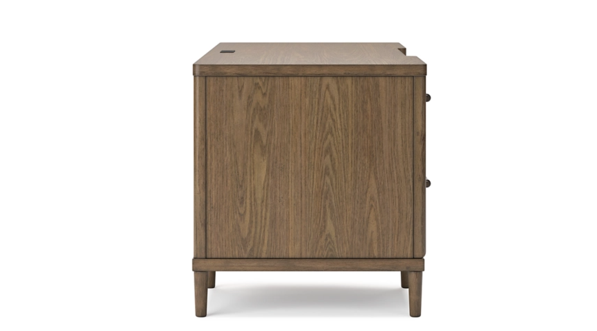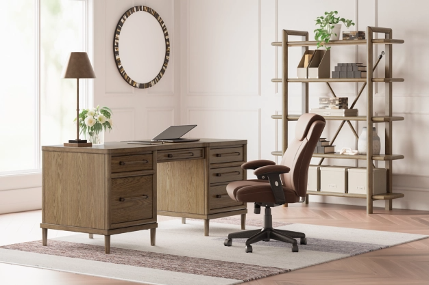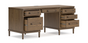 Give your mid-century modern decor that finishing touch with this home office desk. Spacious drawers with unique wooden drawer pulls enhance the design with stunning style. This desk takes minimalism to the max. Made with hardwood solids, oak veneer and MDF substrate Brown oak finish Wood and metal drawer pulls...