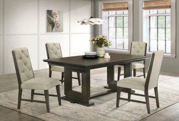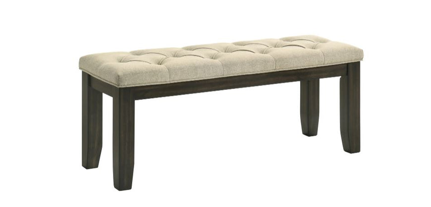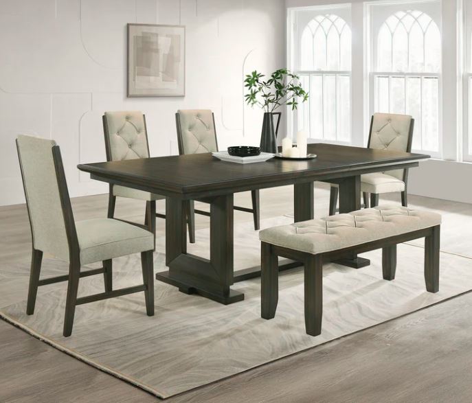 This beautifully crafted dining set features a sleek, dark-finished table with sturdy legs that provide a durable and welcoming surface for everyday meals and special gatherings. The coordinating upholstered chairs and bench showcase elegant tufted detailing, offering a touch of sophistication along with plush, supportive seating. The versatile bench adds a modern twist, perfect for creating a casual yet refined atmosphere. Whether you're hosting dinner parties or enjoying quiet family meals, this set effortlessly combines contemporary elegance with practical design to make every moment around the table truly memorable.