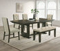 This beautifully crafted dining set features a sleek, dark-finished table with sturdy legs that provide a durable and welcoming surface for everyday meals and special gatherings. The coordinating upholstered chairs and bench showcase elegant tufted detailing, offering a touch of sophistication along with plush, supportive seating. The versatile bench adds...