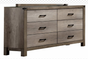 Thi sleek dresser has a light grey finish, a clean frame, and flat drawer panels. This rustic styling dresser features 6 drawers with center metal glides. Black metal bar hardware matches the accents on the top corners of the frame. Pair with the bed in this collection for a stylishly refined bedroom...