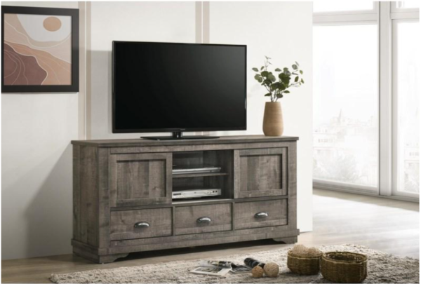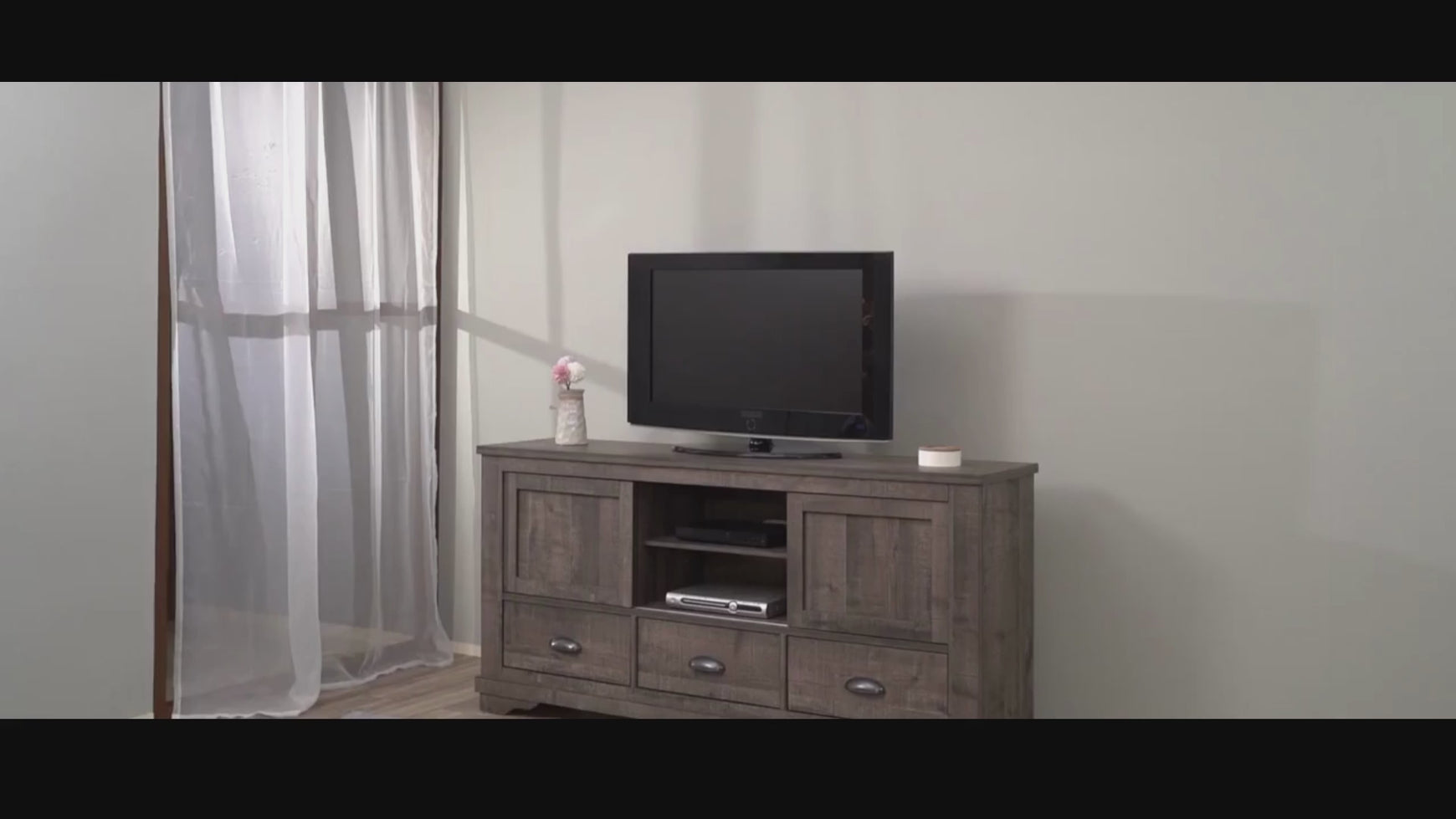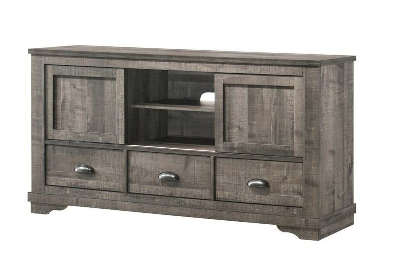The Coralee media console offers ample storage for all your electronics. It features two open compartments, two wooden side doors, and three bottom storage drawers. It is adorned with metal pull handles. It stands on bracket feet.