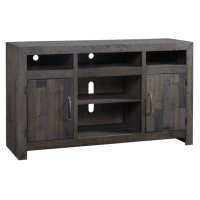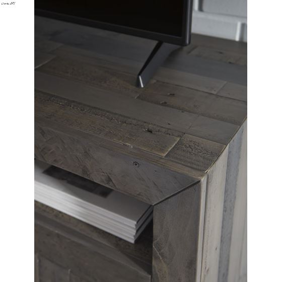 The Mayflyn TV stand with optional fireplace makes what’s old, what’s new. Serving up a fresh look in urban farmhouse style, it’s crafted with reclaimed pine wood loaded with nail holes, nicks, gouges and grooves—marks of “imperfection” for all the more authentic beauty. Offset plank effect and a weathered charcoal gray finish give the ultra-linear profile a casually cool sensibility. Enhance the rustic romance by opting for the optional electric fireplace insert (sold separately).