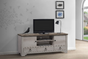 The contemporary rustic Patterson TV Console lends a casual country cottage appeal to any home. The white-neutral tone adds to the refreshingly light feel that will easily blend with any color scheme you choose. The finish is durable melamine. The drawers are English dovetail corners, and Kenlin metal drawer glides...