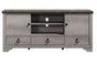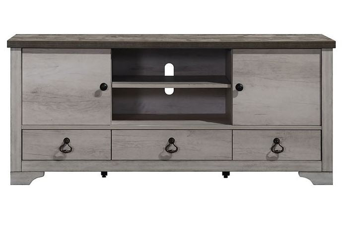 The contemporary rustic Patterson TV Console lends a casual country cottage appeal to any home. The white-neutral tone adds to the refreshingly light feel that will easily blend with any color scheme you choose. The finish is durable melamine. The drawers are English dovetail corners, and Kenlin metal drawer glides for everyday use. Perfect for storing all of your “stuff” so you can rest easy.