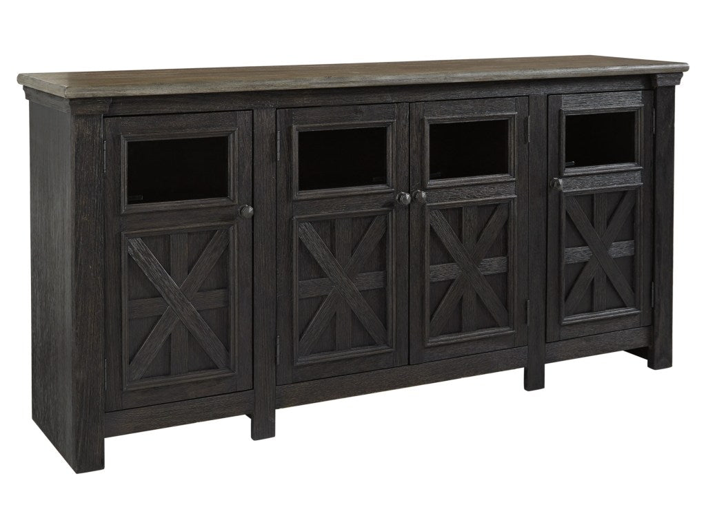 Shabby chic with a hint of down home country is what gives the Tyler Creek TV stand standout style. Appealing to today’s more relaxed sensibilities, its richly rustic two-tone effect blends a textured black finish with a weathered gray-brown top for an easy-elegant aesthetic. Framed doors with cross-buck detailing and clear glass insets bring a touch of modern farmhouse to the scene.