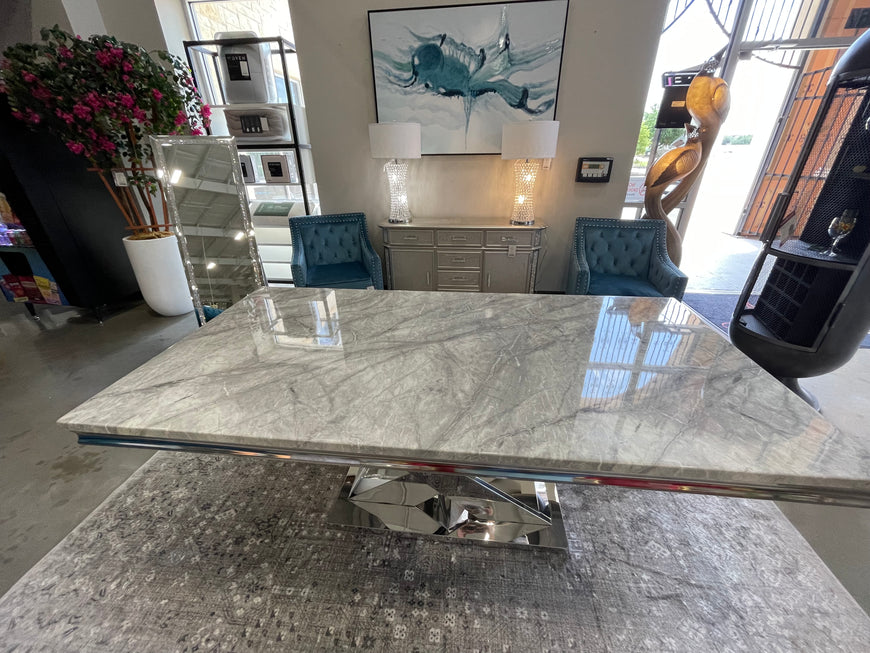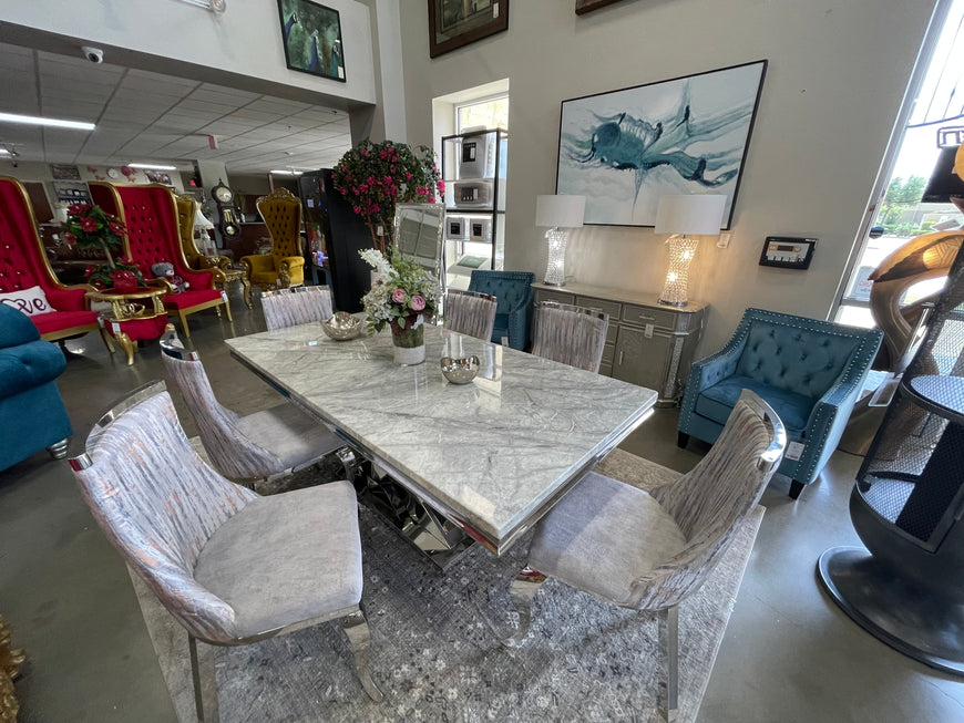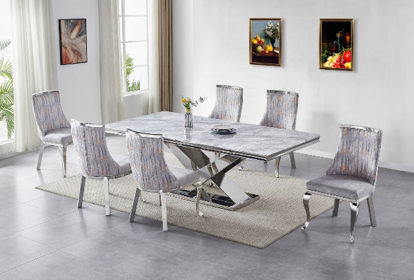 This stainless steel dining set gives a nice touch to your dining spaces. The dining table is crafted of genuine grey marble with a gleaming silver finish accenting the stainless steel base. Dining chairs feature a seamless silver stainless steel frame on top of the chairs and silver stainless steel legs.