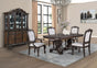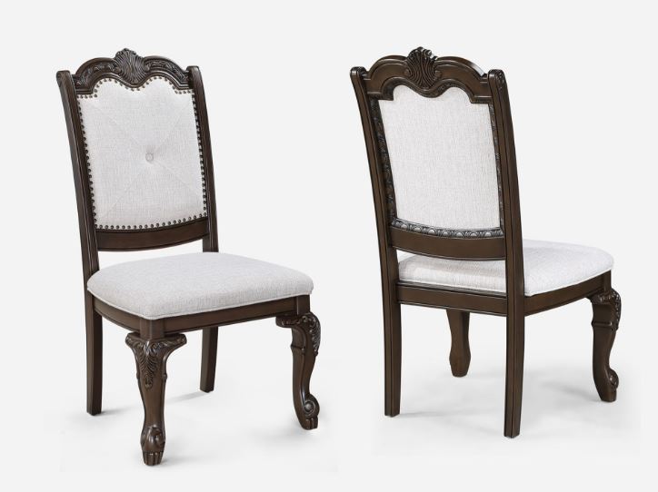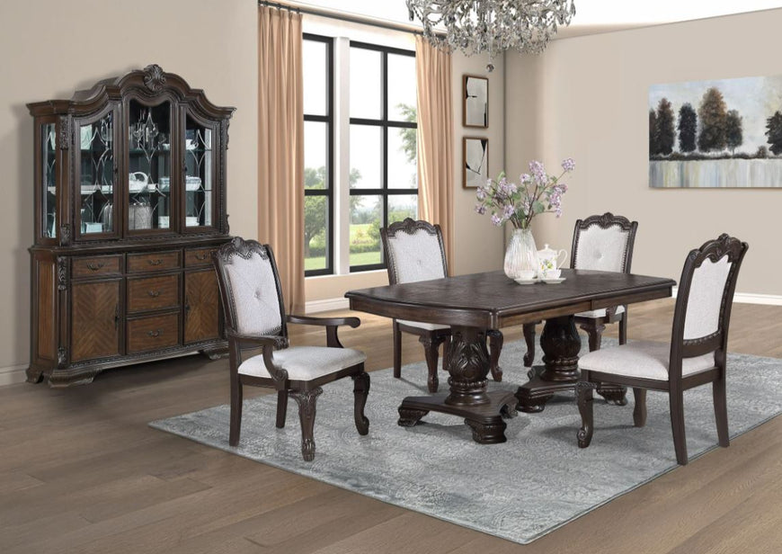Elevate your dining experience with this exquisite and elegantly crafted set, designed to bring timeless sophistication to your home. The grand rectangular table features a rich, dark finish and intricately carved double pedestal base, making it the perfect centerpiece for formal gatherings and family dinners alike. The chairs boast beautifully detailed frames with luxurious upholstery, offering both comfort and refinement. Paired with an optional matching china cabinet, this set delivers classic European-inspired charm with ample storage for fine dinnerware and décor. Designed for those who appreciate traditional craftsmanship and impeccable style, this dining set transforms any space into a statement of elegance. Set comes with Table, 2 Arm Chairs & 4 Side Chairs.