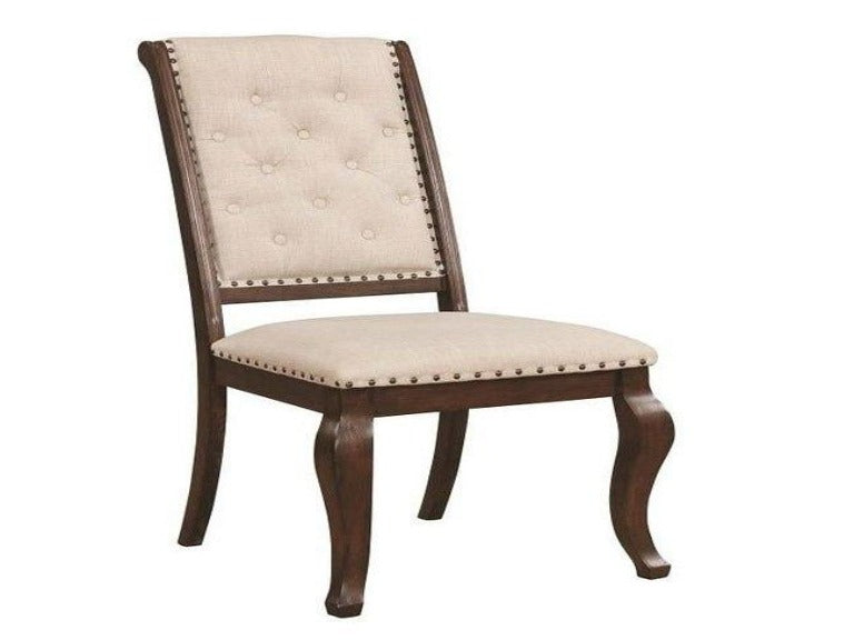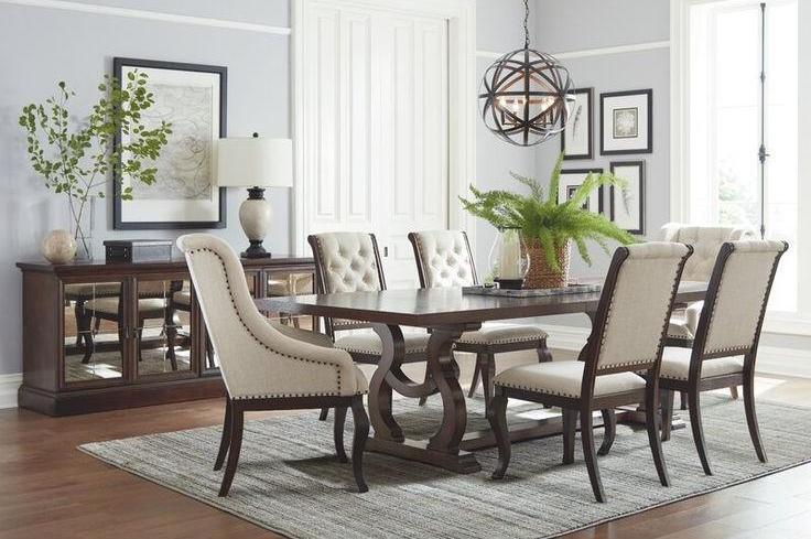 The Glen Cove Dining Room Collection is engineered first for quality and then crafted for exceptional style and comfort! The table has a 20-inch removable extension leaf to accommodate guests. Arm chairs and bench are fully upholstered with button-tufted seats and hand applied nailhead trim. The server has antique mirror glass panels.
