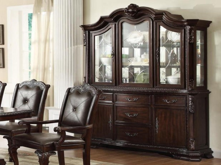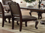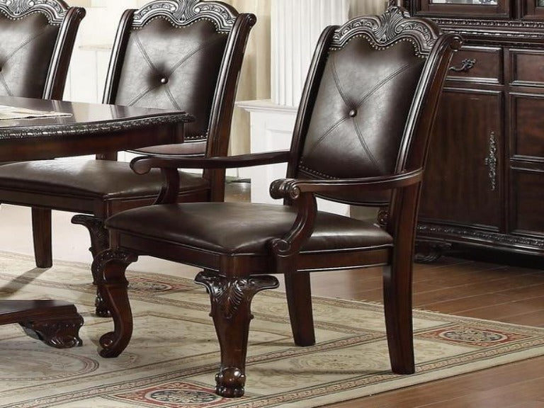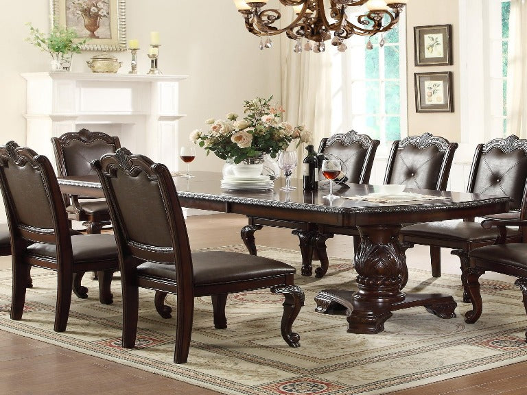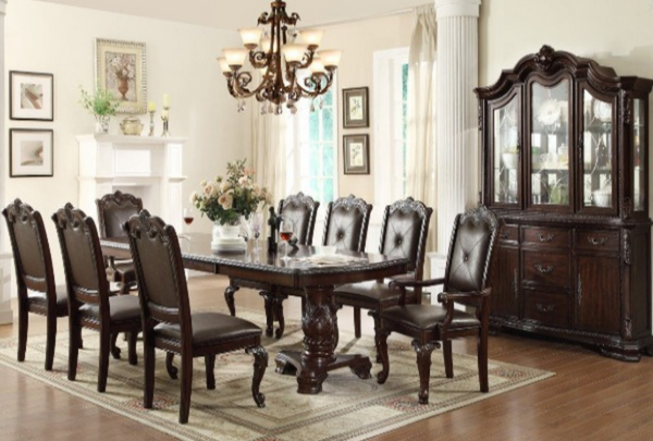 Kiera carries a very elegant and traditional style that will bring a timeless atmosphere to your home. Exquisite carved details and ornate trims are bathed in a rich brown tone over the select veneers of each piece. Side and arm chairs are padded and upholstered in a dark brown color faux leather to provide you and your guests with luxurious comfort. Grand enough to seat eight adults comfortably the dining table comes with two 18 inch leaves to extend it from 72 inches to 108 inched. Easily have friends over for fabulous gourmet meals and cocktails in your refreshed and fashionable dining room.