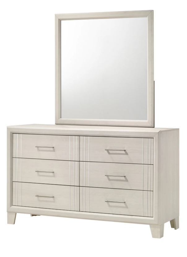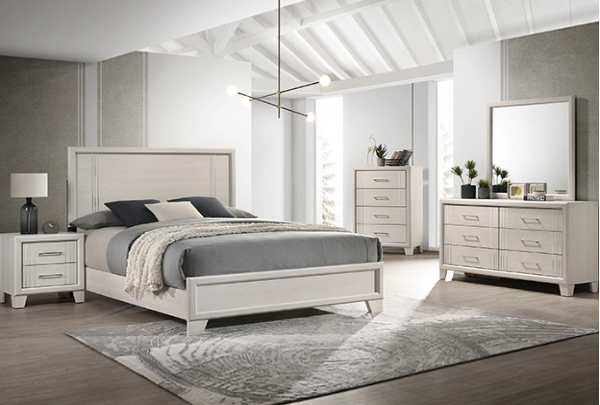 This elegant bedroom collection presents a sophisticated ensemble perfect for creating a refined modern aesthetic in your sleeping quarters. The suite features a sleek, minimalist design with crisp, clean lines and a lustrous white finish that exudes contemporary charm. Anchoring the set is a robust panel bed with a prominent headboard, promising a sturdy and stylish centerpiece. Flanking the bed are complementary case pieces, offering ample storage with their smooth-gliding drawers accented with chic silver-toned hardware.