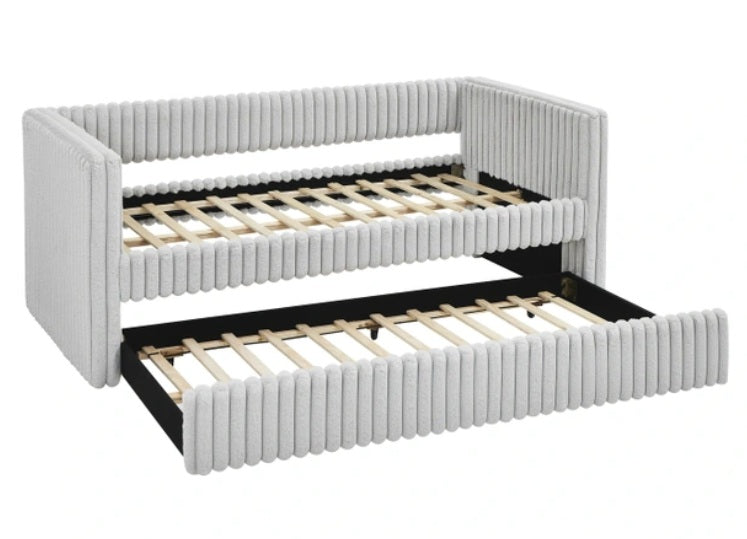 This elegant and contemporary daybed is a testament to luxurious comfort and sophisticated design. Crafted with a plush, tufted upholstery in a serene, neutral tone, it promises to blend seamlessly into any modern home decor. The unique channel tufting adds texture and an extra touch of opulence, inviting you to lounge in style. Whether it’s for leisurely daytime repose or as a chic solution for unexpected guests, this daybed is as practical as it is stylish, offering a versatile centerpiece for your living space.