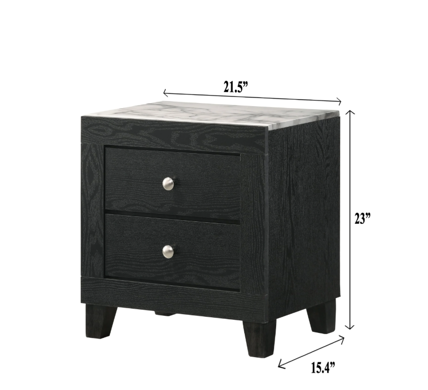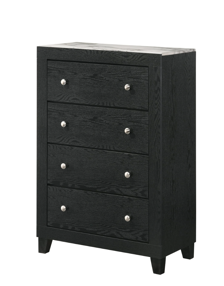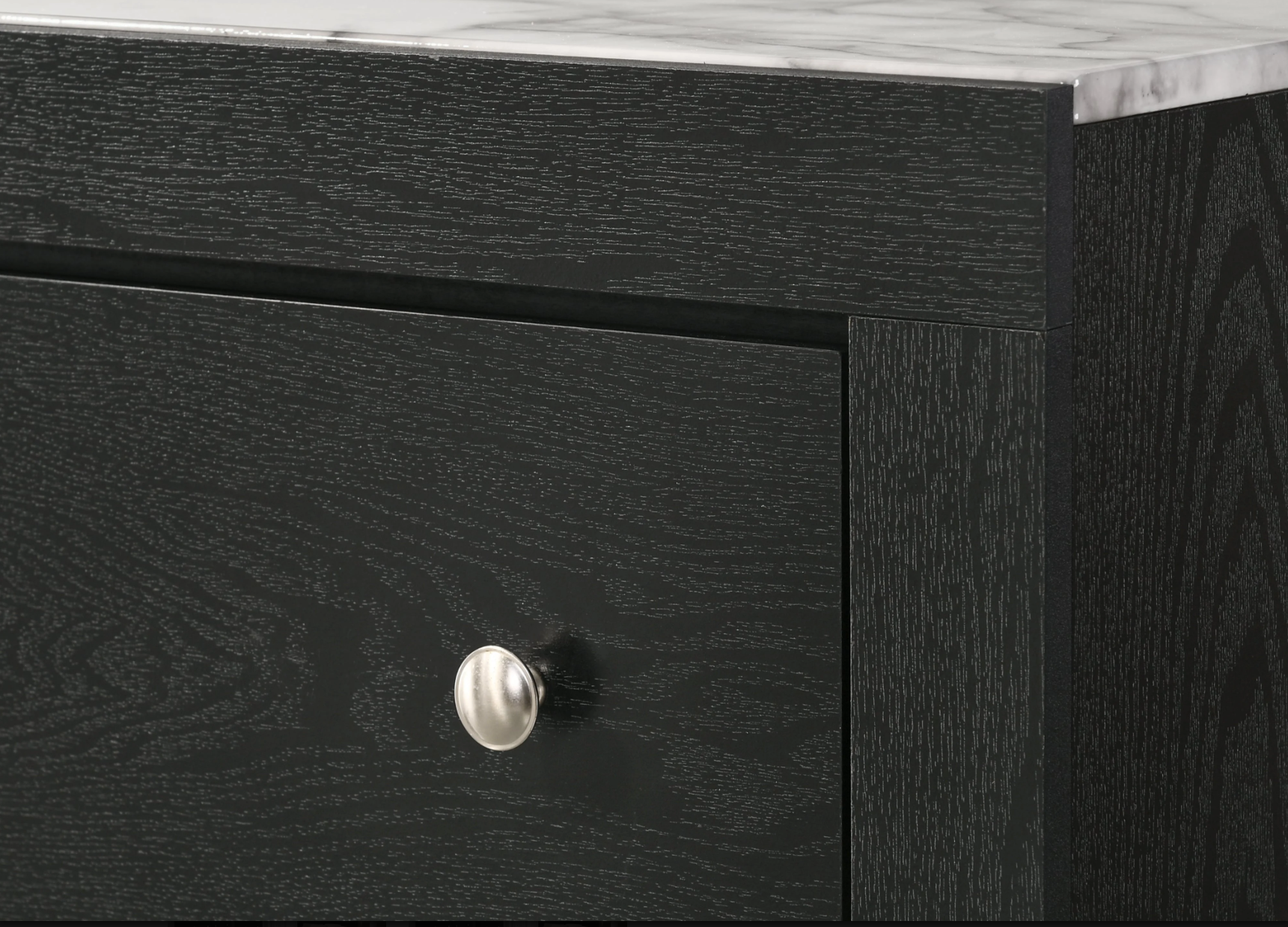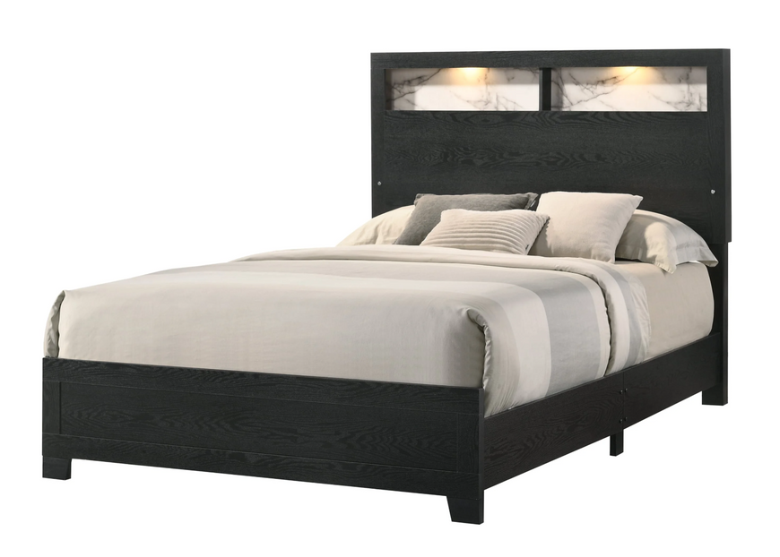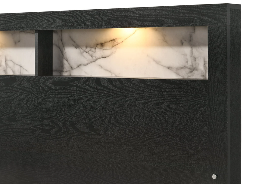 This elegant bedroom collection exudes sophistication with its sleek, dark finish and modern design. The sturdy construction of each piece showcases a rich, textured wood grain, offering both durability and style. The bed, the centerpiece, features a bold, high headboard with built-in shelving and decorative back panels, enhanced by soft illumination for a cozy ambiance. Faux marble tops and sleek knobs accent the case pieces. The harmonious blend of straight lines and minimalistic design ensures this collection will anchor a bedroom with a contemporary yet timeless appeal.