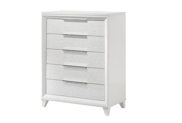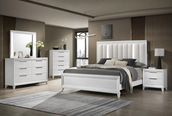 The Cressida will surely make a statement in your bedroom. It features tapered front feet, a low footboard, an upholstered cushion with LED lights on the headboard, and comes in a white finish. This set will make you fall in love all over again from the led lights to the finish in the case pieces.