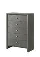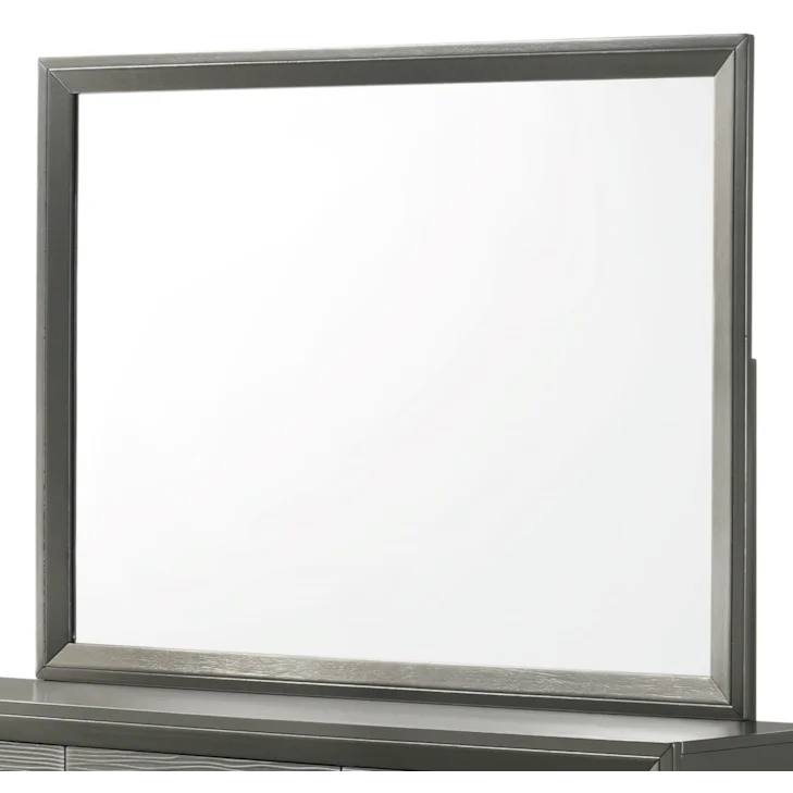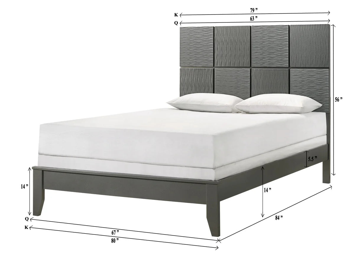 This bedroom collection is the embodiment of sleek, contemporary design, characterized by its rich finish and distinctive textured front panels. The centerpiece, a chic bed with a statement headboard, features geometric paneling that adds depth and interest. Flanked by a matching nightstand and complemented by a spacious dresser with a minimalist mirror, the set offers both style and utility. The clean, linear hardware harmonizes with the set's modern aesthetic, providing a subtle metallic contrast.