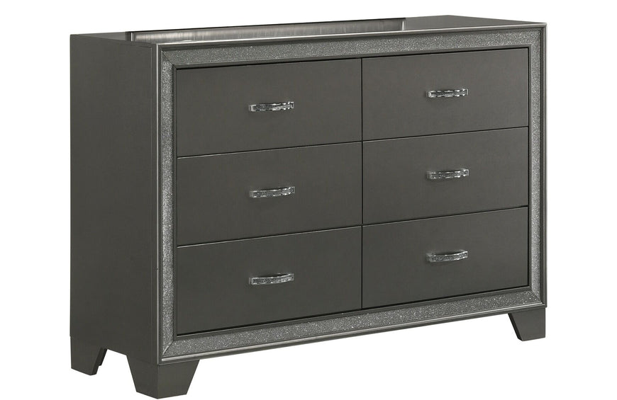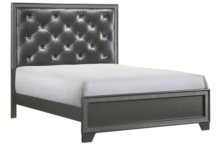Relax in luxury at the end of your day in this glam panel bed. Reminisce on Hollywood's golden age with a button-tufted headboard accented by sparkling embellishments. A dark gray finish brings a modern edge to your bedroom enhancing a clean and sleek aesthetic.