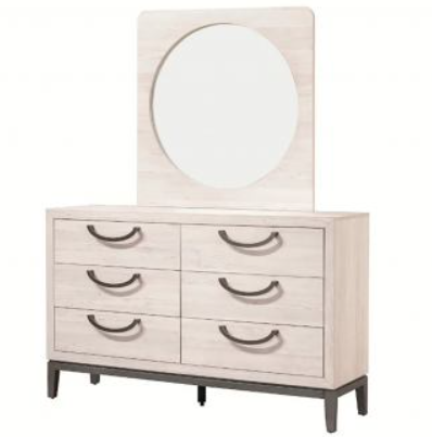 Experience the blend of minimalism and elegance with this chic bedroom ensemble. Crafted with a light and airy finish, it creates an inviting atmosphere while the sleek lines and subtle contrasts in color emphasize a modern aesthetic. Each piece showcases thoughtful craftsmanship with unique drawer pulls that add a touch of character. The gracefully arched headboard anchors the space, offering a serene focal point.