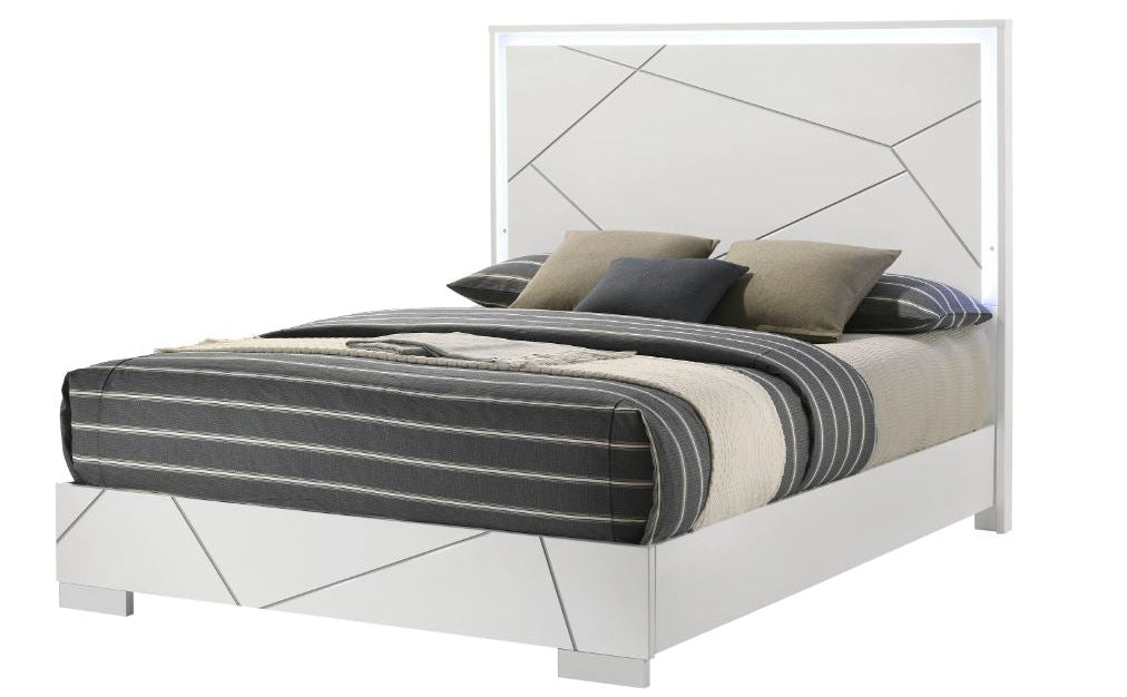 Transform your bedroom into a contemporary sanctuary with this sophisticated and stylish furniture ensemble. Defined by its bold geometric accents and pristine high-gloss finish, this collection exudes modern elegance while maintaining a clean, minimalist aesthetic. The centerpiece bed is enhanced with a dramatic LED-lit headboard, adding ambiance and a touch of luxury to your space.