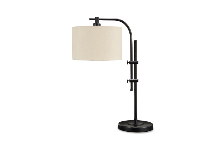 This metal desk lamp features a beautiful black finish that adds a rich accent to your living space. The lamp is elegantly curved with soft edges, and is adjustable to provide targeted illumination. Topped off with a crisp white drum shade, this lamp provides a subtle and appealing contemporary design wherever placed.