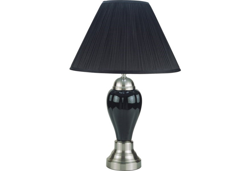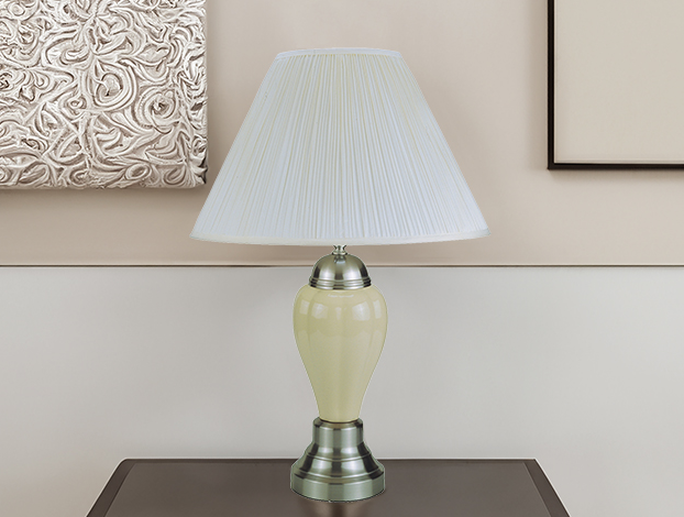 Illuminate your space with this elegantly crafted table lamp. Featuring a glossy ivory base and contrasting metallic details, it's perfect for a modern look. The broad, pleated shade offers a diffused light ideal for any setting.