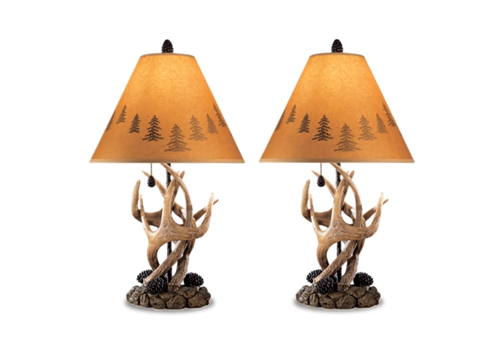 Bring home an upscale touch of mountain retreat style with this richly rustic table lamp. Amazing how a rugged mix of rock, antler and pinecone accents looks so beautifully refined in the right setting. Set of 2 table lamps Richly rustic base crafted of poly resin Paper silhouette shade with...
