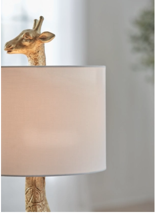 This giraffe lamp combines contemporary style with eclectic charm. The curious animal peeks out over the top of the shade, adding a playful touch to the safari-inspired vibe. For glam appeal, a goldtone finish completes the look. Made of polyresin with drum hardback fabric shade Goldtone finish On-off switch 1...