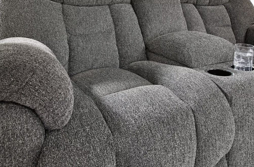 Sometimes seeing is believing. And you can rest assured that this reclining loveseat with console is every bit as indulgent as it looks. Designed to put you in the lap of luxury, the generously scaled seating—wrapped in a wonderfully plush and practical charcoal gray Next-Gen Nuvella™ upholstery—sports pillow-wrapped armrests and curvaceously cushioned head-neck support for feel-good flair.