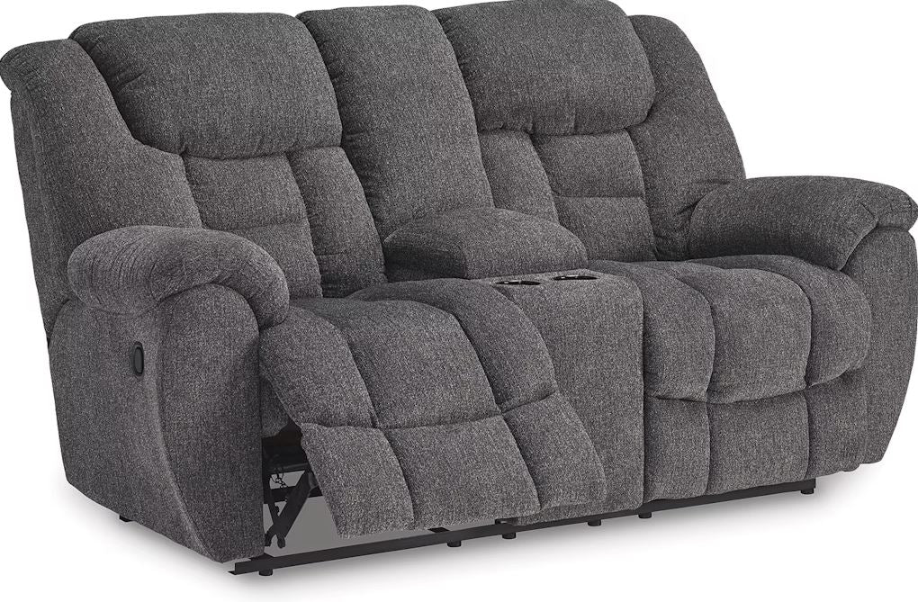 Sometimes seeing is believing. And you can rest assured that this reclining loveseat with console is every bit as indulgent as it looks. Designed to put you in the lap of luxury, the generously scaled seating—wrapped in a wonderfully plush and practical charcoal gray Next-Gen Nuvella™ upholstery—sports pillow-wrapped armrests and...