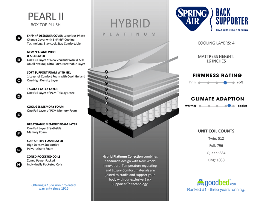 The Pearl II Box Top Plush is a hybrid mattress that combines the best individual coil unit with Talalay Latex, New Zealand wool and silk for breathable comfort and a generous layer of cooling memory foam giving that comfortable, cozy feel you love in a mattress. EnFinit® DESIGNER COVER Luxurious Phase Change Cover with EnFinit® Cooling Technology. The naturally healthy latex layer adds longevity, support, and coolness to the mattress. Cool gel technology is infused in the memory foam helping to reduce motion transfer and delivering reliable pressure relief where it's needed most. Get the night's sleep you deserve with the Pearl II Box Top Plush Mattress.