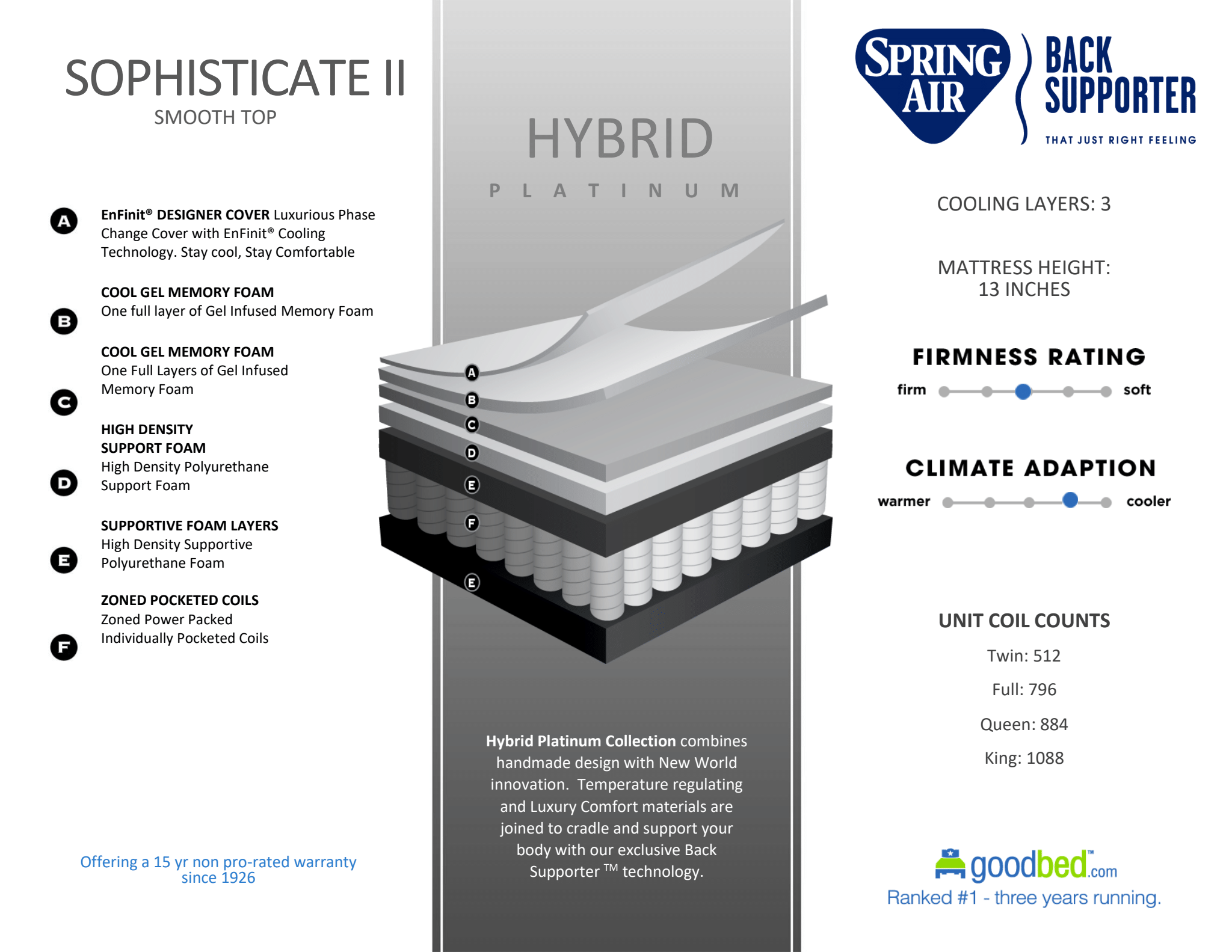 The Sophisticate II Smooth Top is a hybrid mattress that combines the best individual coil unit with EnFinit® DESIGNER COVER Luxurious Phase Change Cover with EnFinit® Cooling Technology. Cool gel technology is infused in the memory foam providing pressure relief where it's needed most. The Sophisticate does not sacrifice support for comfort with its high-density Back SupporterTM technology improves circulation and equalizes pressure distribution. along with the SuperEdge Plus TM creates a stable sleeping area across the entire surface of the mattress. Get the support you need and the good night's sleep you want with the Pearl II Box Top Plush Mattress.