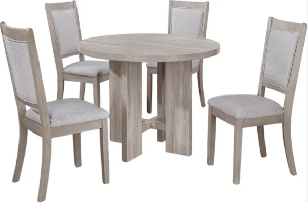 This charming dining set exudes a coastal-inspired aesthetic, perfect for creating a light and airy dining atmosphere. The set centers around a round table with a weathered wood finish, offering a casual yet refined dining surface that invokes a sense of beachside serenity. Complemented by a set of elegantly crafted chairs, each piece showcases a gentle fabric upholstery in a calming neutral tone, providing comfortable seating that invites diners to linger longer. The chair backs' subtle curvature and the table's sturdy pedestal base combine to create a cohesive look that balances rustic textures with clean, contemporary lines.