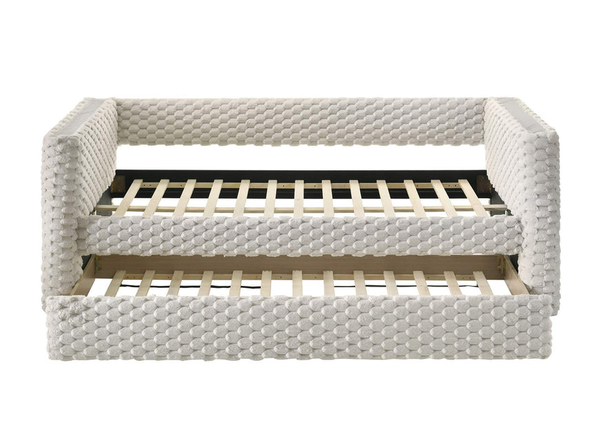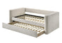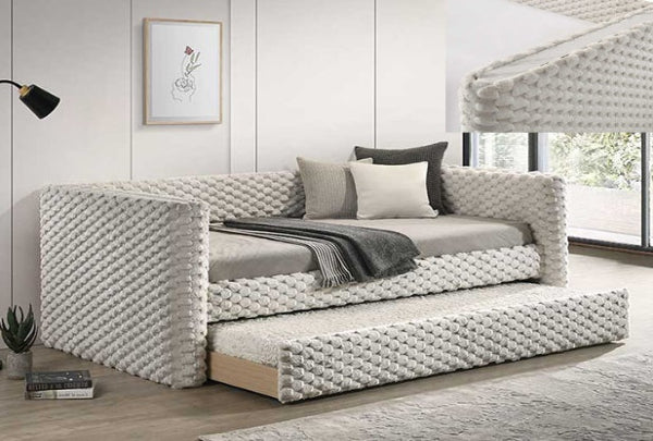 Immerse yourself in the epitome of modern elegance with this meticulously crafted daybed, designed to infuse a sense of sophisticated tranquility into any room. Its sleek silhouette is gracefully accentuated by sumptuous, textured fabric that captures the light and the attention in equal measure. The contemporary charm is further enhanced by its soft, neutral palette, ensuring it serves as a versatile statement piece that complements a diverse range of interior themes. A subtle marble accent on the arms also provides a spot for to rest small items. With an additional pull-out trundle discreetly nestled beneath, this daybed seamlessly combines form with function, offering an inviting space for relaxation or an elegant solution for accommodating guests.
