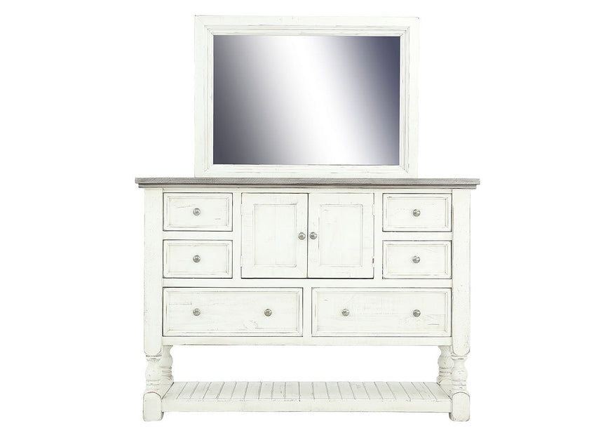 Farmhouse chic with a touch of old world charm, this vintage bedroom group will be a stylish centerpiece to your bedroom. Features 100% solid pine wood construction with framed molding, hand turned posts and a distressed rustic finish, all contributing to its relaxed farmhouse feel. The dresser has six drawers for ample storage and the landscape mirror has a beveled edge and wood frame.
