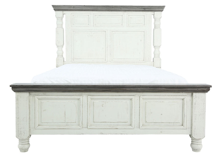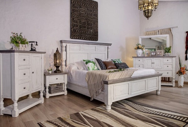 Farmhouse chic with a touch of old world charm, this vintage bedroom group will be a stylish centerpiece to your bedroom. Features 100% solid pine wood construction with framed molding, hand turned posts and a distressed rustic finish, all contributing to its relaxed farmhouse feel. The dresser has six drawers...
