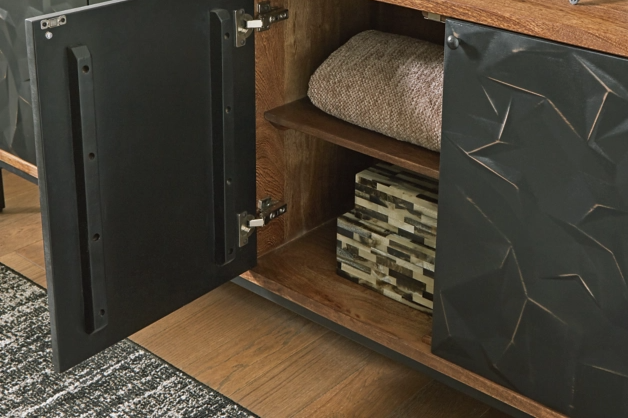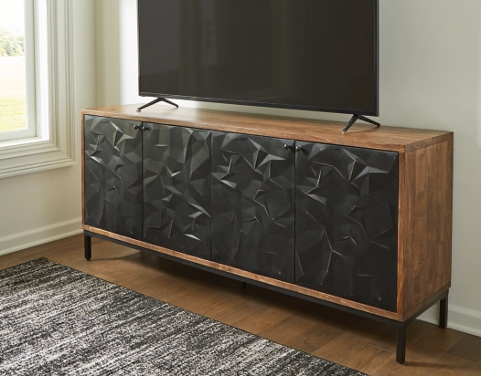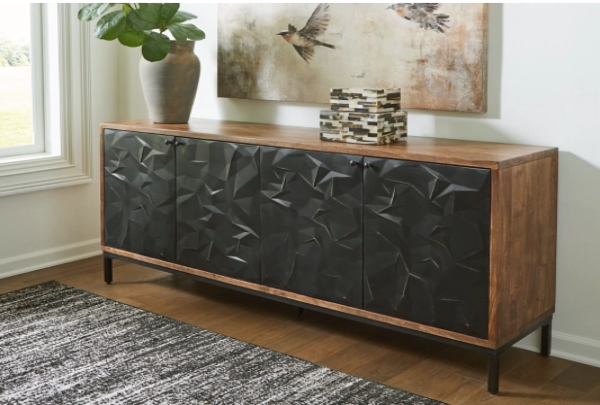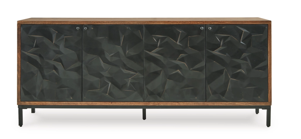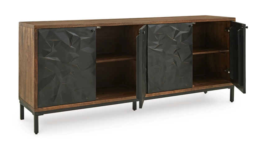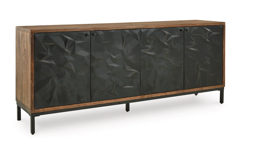 Revamp your home with this stylish accent cabinet. Featuring four doors with a captivating textured pattern, it instantly becomes the centerpiece of your room. The cabinet's interior shelves make it versatile for use as a buffet, console or media cabinet. It's a smart choice that elevates your home on multiple levels.
