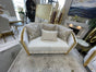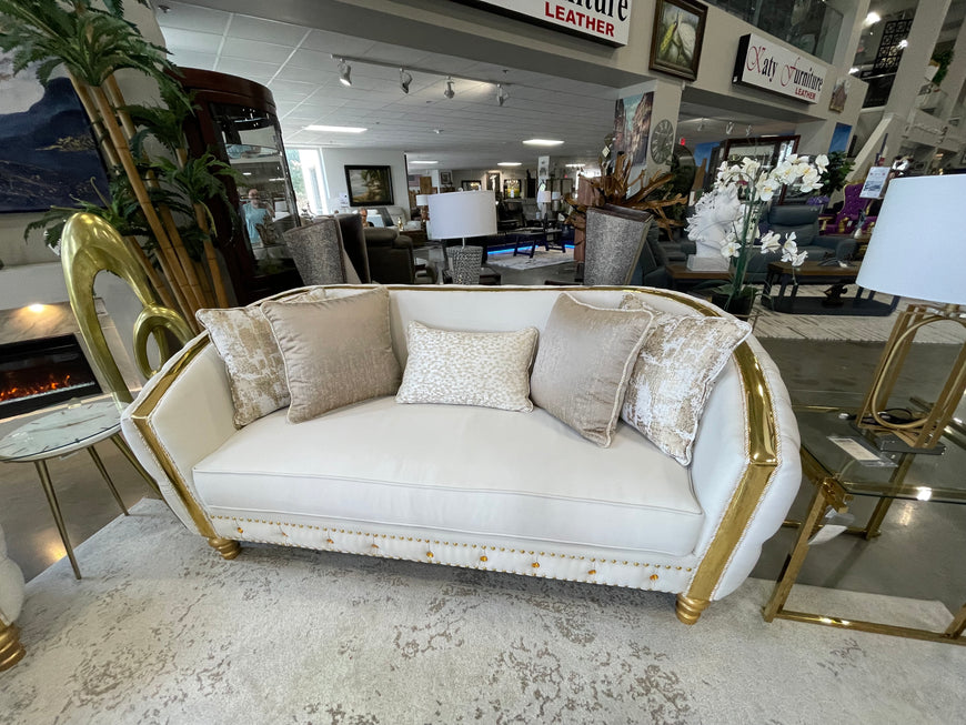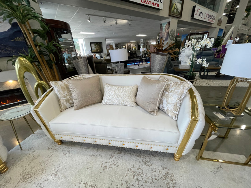 Transform your living space into a regal retreat where timeless elegance meets modern comfort. This luxurious three-piece set includes a statement sofa, a cozy loveseat, and a high-back accent chair—each meticulously crafted to blend classical charm with contemporary sophistication. This set exudes refined glamour by featuring gracefully curved silhouettes, tufted detailing, and sculpted gold accents.
