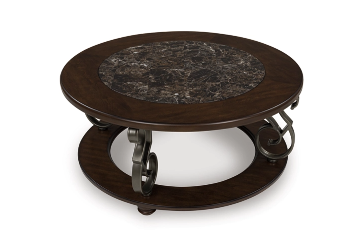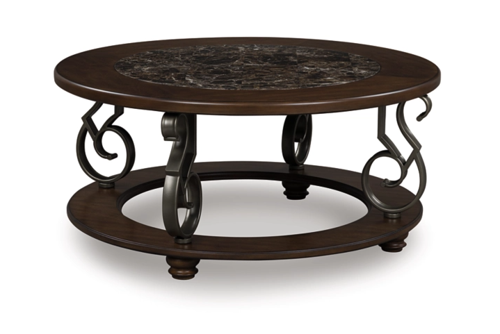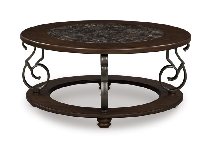 This coffee table is nothing short of stunning. A rich, warm brown finish exudes opulent elegance, while ornate metal legs add a touch of timeless sophistication. It's perfect for displaying your delicious decor in grand style. Made with birch veneer, decorative laminate and MDF substrate Top with faux marble laminate...