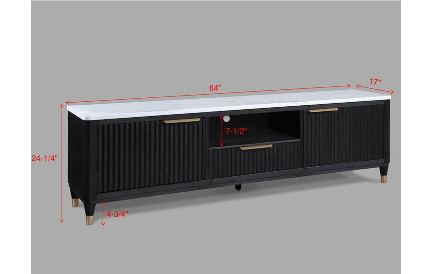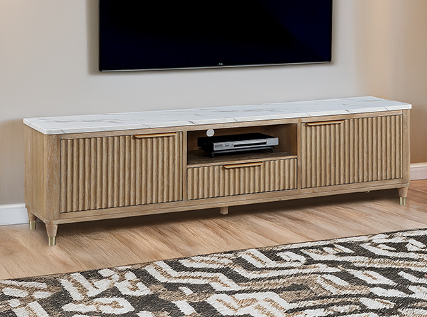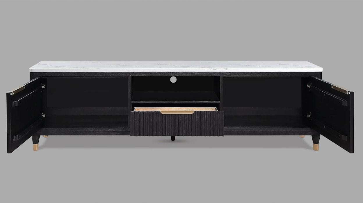 The Kara TV stand features a sleek and contemporary design. With ample storage and a stylish finish, it is a perfect addition to any living room, offering both functionality and modern appeal.
